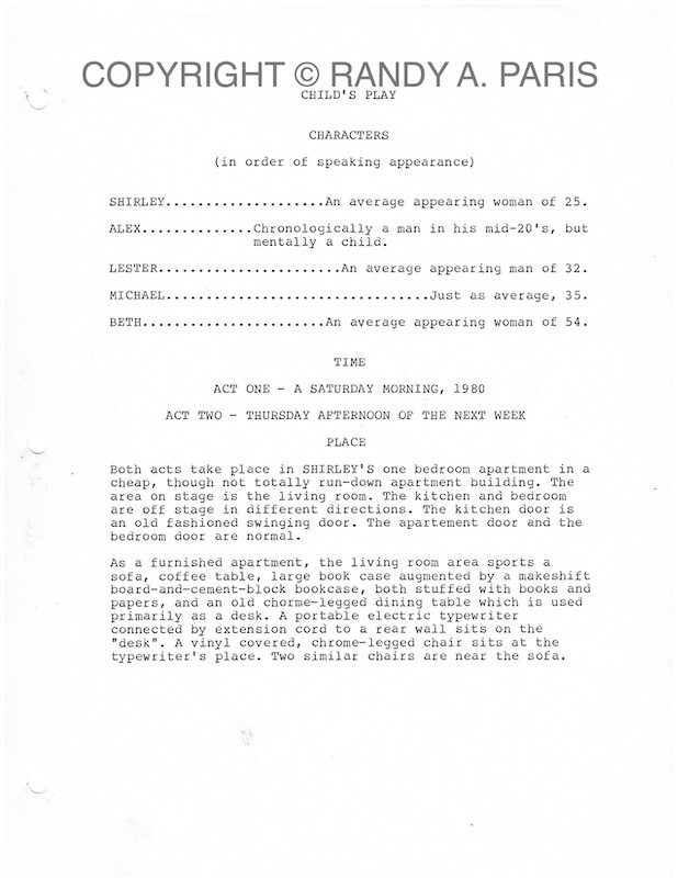 Child's Play made it to the final rounds of two national playwrighting contests, but never to a stage. By now it could definitely be considered an 80's period piece, but, unfortunately, the central driving issues are still haunting us nearly 50 years later.