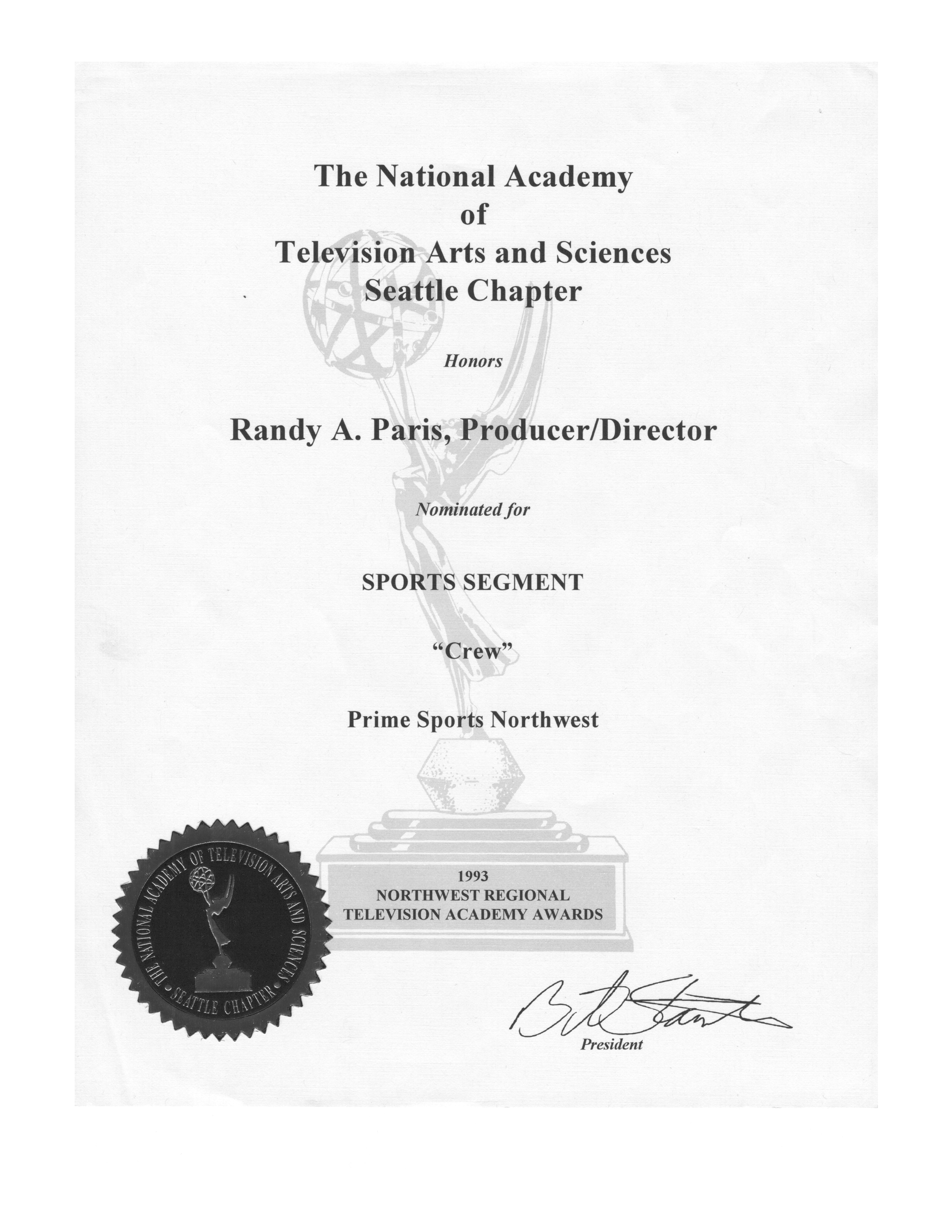 Each year, The National Academy of Television Arts and Sciences (NATAS) awards National Emmys for individual excellence within the television industry. The purpose of Regional Emmy Awards is to recognize such achievements within smaller geographic ares of the country. There are 17 regions. The Northwest region includes Alaska, Idaho, Oregon and Washington. Nominations are chosen by a panel of experts in each category from submitted entries. These are then submitted to other chapters for judging.